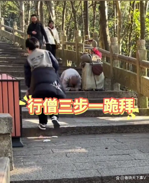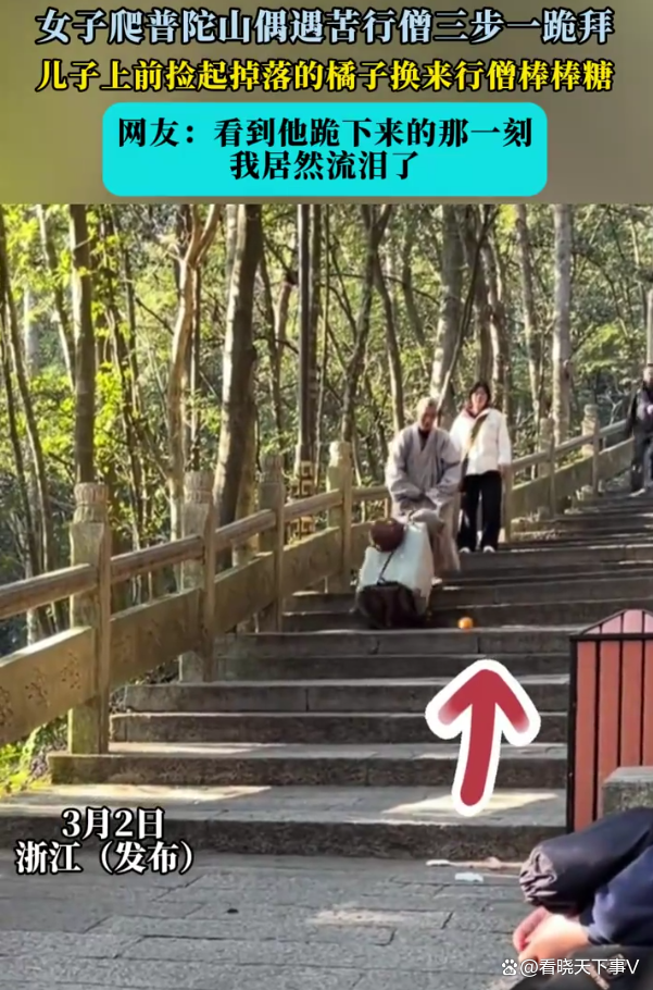 看哭了!浙江舟山,女子带着孩子去爬普陀山,期间偶遇苦行僧三步一跪拜,原本是两个没有交集的人,却因为苦行僧掉落的橘子,联系到了一起,孩子看到橘子掉落便主动上前拾起归还,而苦行僧跪拜的那一刻,让人泪目