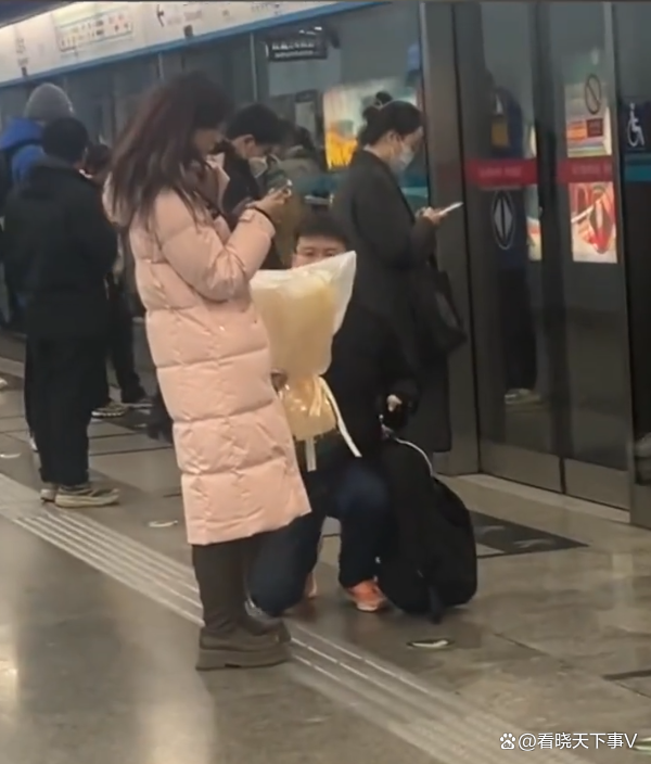 从路人拍摄的视频来看,当时车站的人并不算多,几乎每个人都在一边看手机,一边候车,唯独这名男子,单膝跪在地上,手捧着鲜花,目光紧紧锁定在女生身上,显然是想在情人节这个特殊的日子里,用这种浪漫的方式表达自己的心意