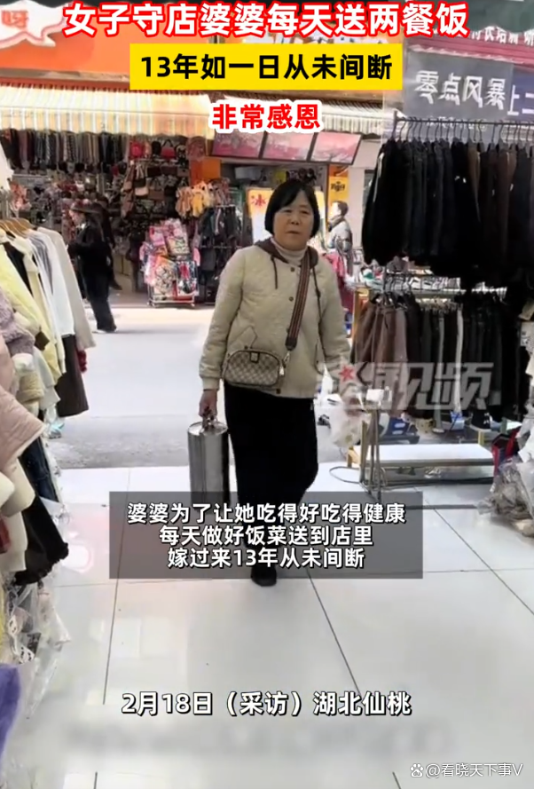 据安徽电视台2月20日报道,杜女士是开服装店的,虽然小店不大,但却离不开人,婆婆为了能让她吃的好一点,健康些,坚持不让她点外卖,每天只要做好饭菜,就会趁热送到店里,自从嫁过来,13年从未中断过,一天两餐,一天都没落过