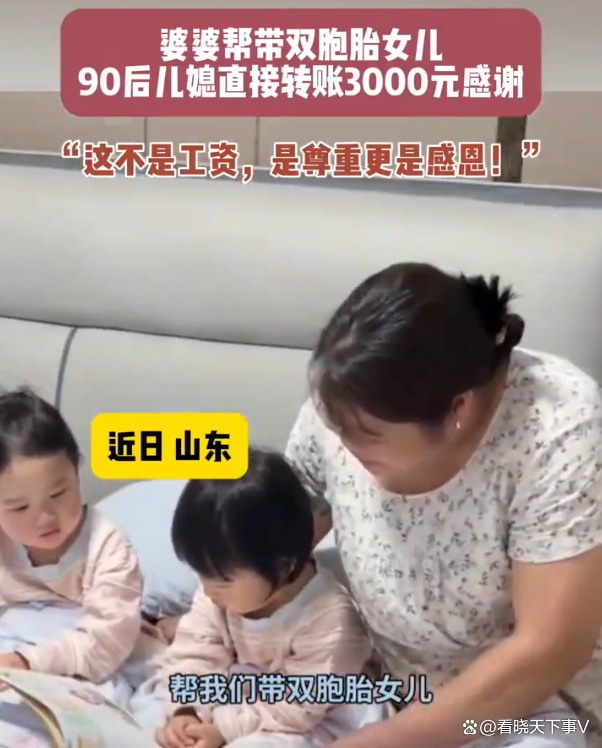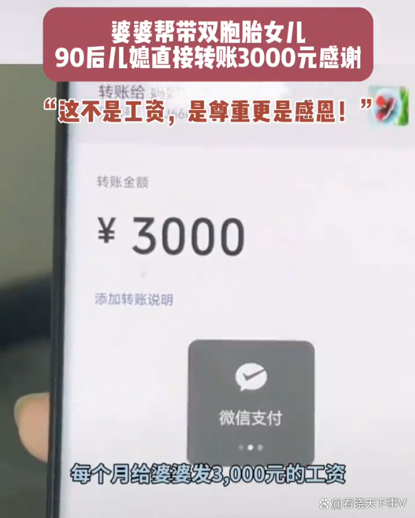 “这婆媳关系肯定好”!山东。一位90后媳妇最近在网上分享了自己和婆婆的暖心故事,让不少网友直呼"这才是婆媳关系的正确打开方式",为了感谢婆婆帮忙带双胞胎女儿,主动给婆婆转账3000块,但这个支付方式,是真的用心了