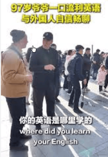 最近,一段视频在网上疯传,视频中一位98岁的老爷爷在西湖边用流利的英语与外国人交流。视频中,这位白发苍苍的老爷爷用流利的英语向来访者介绍“英语角”——一个专为老年人设立的场所。他自信轻松的举止赢得了网友们的一致好评:“这才是真正终身学习的方式!”
