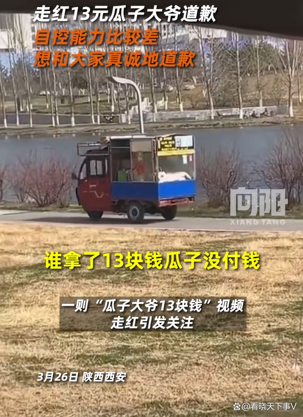 为什么要道歉?陕西西安,一大爷开着车在公园卖瓜子,因为顾客买了13块钱的瓜子没付钱,大爷一气之下就用扩音器在公园循环播放追讨,视频意外走红后,大爷通过媒体道歉,表示自己是一时冲动,可这个事道歉的真不该是他